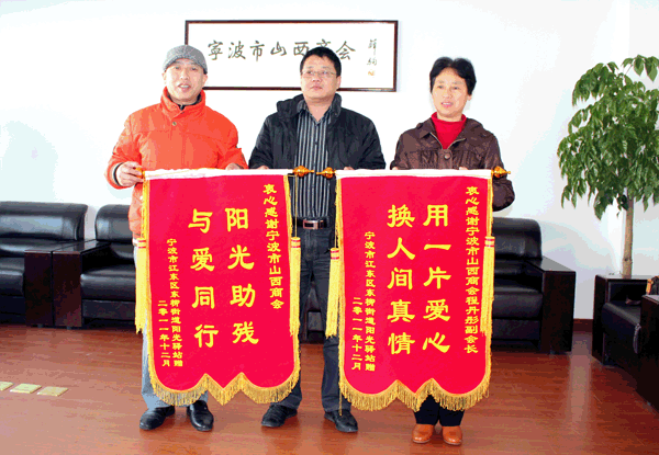 2012年3月13日,宁波江东东柳街道“阳光驿站”肖宝珠主任为了感谢宁波山西商会对“阳光驿站”残障儿童的关爱,特前来商会表示感谢并给商会和商会副会长程丹彤送了锦旗。商会副会长梁建军和秘书长杜晓琪接待了他们,并表示这是我们应该做的,这样的爱心活动也已列入商会工作常态化。