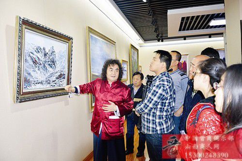 蔚国银(左一)在山西美术馆给观众介绍自己的雪域高原油画巡展作品