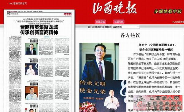 7月20日,山西晚报2版头条发表天津山西商会张世伦会长关于传承晋商精神的讲话摘要。张世伦会长说:“煤老板不是山西的代名词,现代产业,晋商还有数不清的排头兵!晋商的复兴,其标志不是人们熟知能祥的李彦宏、郭台铭等少数几位,而是需要晋商群体性的崛起!对此,津门晋商已经率先行动!”