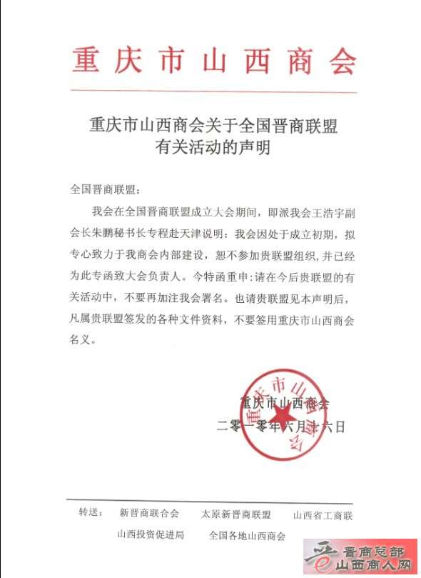 全国晋商联盟: 我会在全国晋商联盟成立大会期间,即派我会王浩宇副会长朱鹏秘书长专程赴天津说明:我会因处于成立初期,拟专心致力于我商会内部建设,恕不参加贵联盟组织,并已经为此专函致大会负责人。今特函重申:请在今后贵联盟的有关活动中,不要再加注我会署名。也请贵联盟见本声明后,凡属贵联盟签发的各种文件资料,不要签用重庆市山西商会名义。