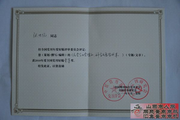 天津山西商会“科学发展结硕果”专题文章获2010年度全国党刊好稿一等奖