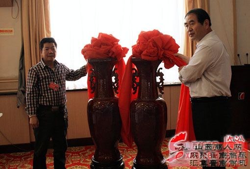 河南省禹州霍家钧窑董事长霍福生(左)向霍州市委、市政府捐赠精美钧瓷花瓶