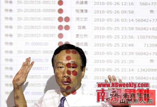 2010年5月26日,郭台铭现身深圳龙华园区,带着海内外200多名记者参观厂区。他在员工康复中心接受媒体提问时,脸上被投影仪映上了文字。