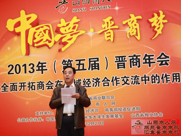 由山西省商业联合会主办、山西商人网承办的,以“中国梦、晋商梦,全面开拓商会在区域经济发展交流中的作用”为主题的2013年(第五届)晋商年会于12月21日在北京山西大厦顺利召开。山西省商务厅、山西省投资促进局、全国各地晋商商会负责人、全国各地晋商精英以及媒体代表近300余人参加了此次会议,共同回顾2013年晋商发展成就,畅享晋商商帮的光荣与梦想。