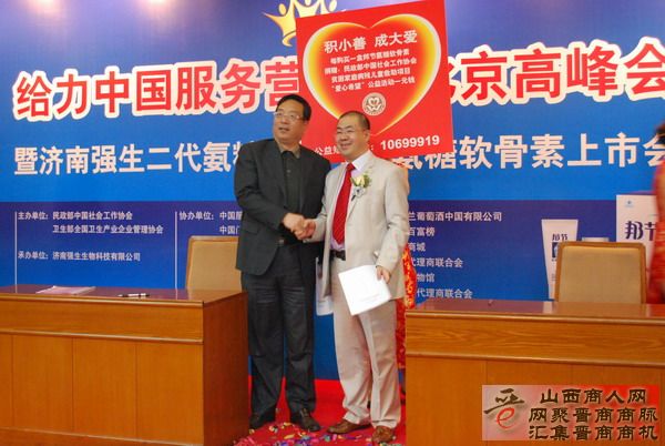 5月13日,由民政部中国社会工作协会、卫生部全国卫生产业企业管理协会主办,济南强生生物科技有限公司承办的给力中国服务营销——北京高峰会暨济南强生二代氨糖邦节氨糖软骨素上市会在北京隆重召开。 樊总作为新晋商代表人物,继承并发扬了晋商“节俭勤奋”的宝贵精神,以强烈的社会责任感,广行善施,回报社会,在扶贫助残中献爱心,会上,樊总与民政部中国社会工作协会王志力秘书长签定了救助协议。