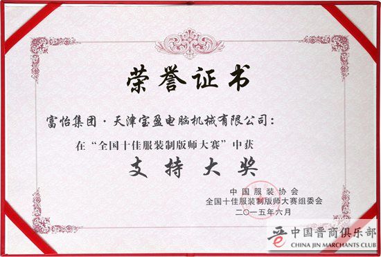 68日中国服装协会为天津山西商会会员企业富怡集团天津宝盈电脑机械有限公司授予了大赛支持大奖!