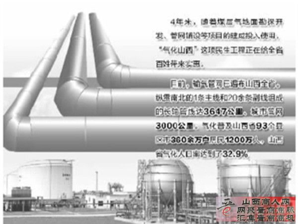 2010年,山西省在“十二五”规划纲要中提出“气化山西”发展战略,对山西丰富的煤层气、天然气、焦炉煤气和煤制天然气等清洁能源进行开发利用,在家用、取暖、车用、发电、工业利用等各方面为全省创造气化条件。用5年时间使供气总量达到218亿立方米,总利用量达到111亿立方米,初步建成“气化山西”的目标。从此,煤炭大省掀起了一场能源变革,由“燃煤时代”步入“燃气时代”。山西省委书记袁纯清指出,气化山西,不仅是一个产业工程,更是造福于民的生态工程。经过4年的建设,随着煤层气地面勘探开发、煤层气井下抽采利用、管网铺设、加气站、焦炉煤气分离甲烷示范工程、煤制天然气示范工程多个项目的建成投入使用,“气化山西”这项民生工程已真正从蓝图走进百姓生活中,正在给全省百姓带来实惠。