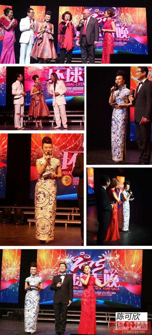 加拿大环球春晚,可欣身着清君高定赞助的华服和纳兰红的青花瓷旗袍主持春晚,她繁星一样的双眼,一袭得体的衣着,修饰出她那阿罗多姿的身材,更是粲然生光;她肌肤胜雪,娇美无匹,容色绝丽,不可逼视;她举手投足间流露出优雅的气质,神态高雅,就像是丛林深处的一朵玫瑰,难得一见,美艳动人,可是阻挡不住一切所有企图接近它的事物,晚会以热闹欢乐的歌舞开场,阵阵鼓声敲响了中国农历新年的喜庆,让现场观众立刻感受到浓郁的过年气息。环球华语的主创班底,均具多年央视经验,充分展现了深厚的创作和制作功底和丰富的大型文艺演出及舞台表现手法,以流畅紧凑的节目编排,将多种表演形式及中加两国文化特色融为一体,通过中加两国极具魅力的主持人以及环球华语特邀艺术顾问娄乃鸣导演与现场台下观众的完美互动,展现出绚丽的灯光舞美设计,震撼炫目的视听效果,营造出欢乐热闹的现场气氛。同时,通过重新编排本地华人文艺团体的节目,使其表演展现出不一样的风采,表达出海外华人华侨浓烈的思乡情怀。除此之外,其它族裔的文艺团体也一同参与表演,共同庆祝中国传统佳节。