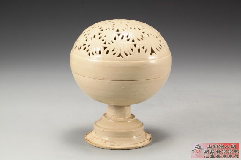 山西瓷器大量以煤烧制,不同于南方的以柴烧制。山西出土的瓷器明显带有北方风貌,窑工技法精妙,可谓化腐朽为神奇,如此次展品中金代介休窑白瓷镂空香熏,胎色洁白,通体施玻璃釉,熏盖由金属刀具镂刻成花卉图案,焚香点燃后,香烟会从空隙间飘散萦绕。足见宋金时期人们对香器使用的讲究(见图一)。另一件金代长治窑黑釉红绿彩玉壶春瓶,圆腹长颈,通体黑釉,釉面施白色化妆土粉,在白粉表面勾绘红绿彩,装饰图案,这种技法在12世纪时在北方窑场出现,是当时窑场工匠的创新(见图二)。