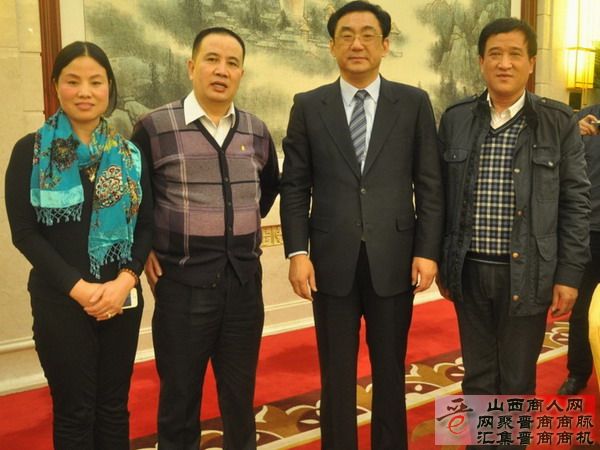 山西省副省长郭迎光和晋商商会兄妹三杰(山西省总商会副会长梁文海左二、山东省山西商会会长梁文旭右一、辽宁省山西商会会长梁文珍左一)合影