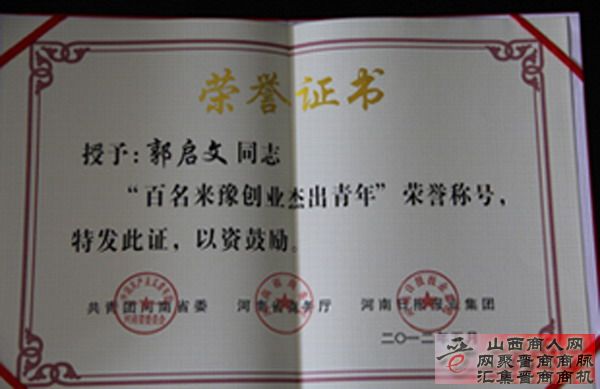 恭喜商会常务副会长郭启文荣获“百名来豫创业杰出青年”荣誉称号