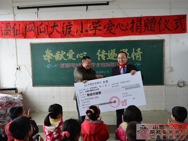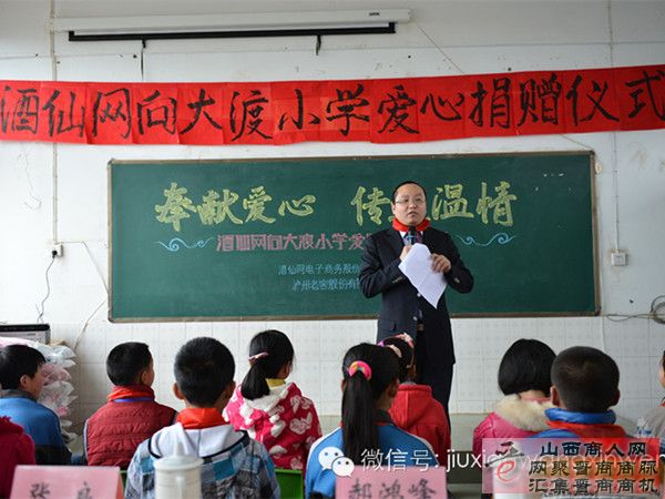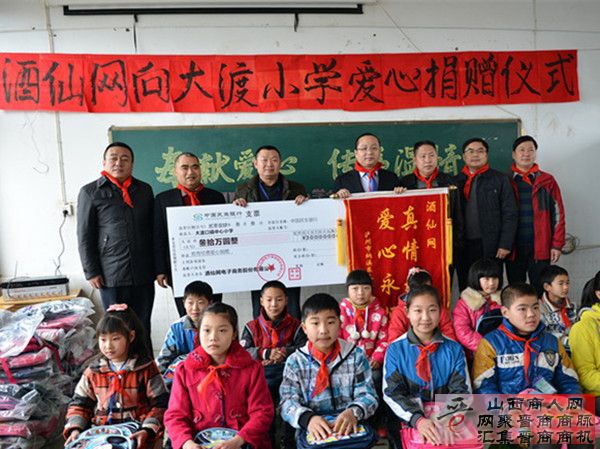 3月3日,由酒仙网、泸州老窖、大渡口镇人民政府、大渡口镇小学共同发起的酒仙网向大渡小学爱心捐赠仪式在大渡口镇小学举行。捐赠仪式上,酒仙网向大渡口镇小学捐赠了30万元教育经费,并现场向学生捐赠了400多套书包及文具。