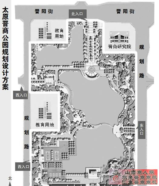 其中,晋商文化区,以展示晋商文化为主,利用小品、雕塑的寓意和硬质景观的塑造来体现文化,北入口处设计了晋商文化名人雕塑和浮雕水景墙,北入口对景为一组具有山西特色的砖雕京墙,浮雕的内容为汇通天下。西入口结合水池设计了“晋门”雕塑,西入口是连接财经大学的入口,财经大学则为培养现代新晋商的摇篮,为新晋商之门。