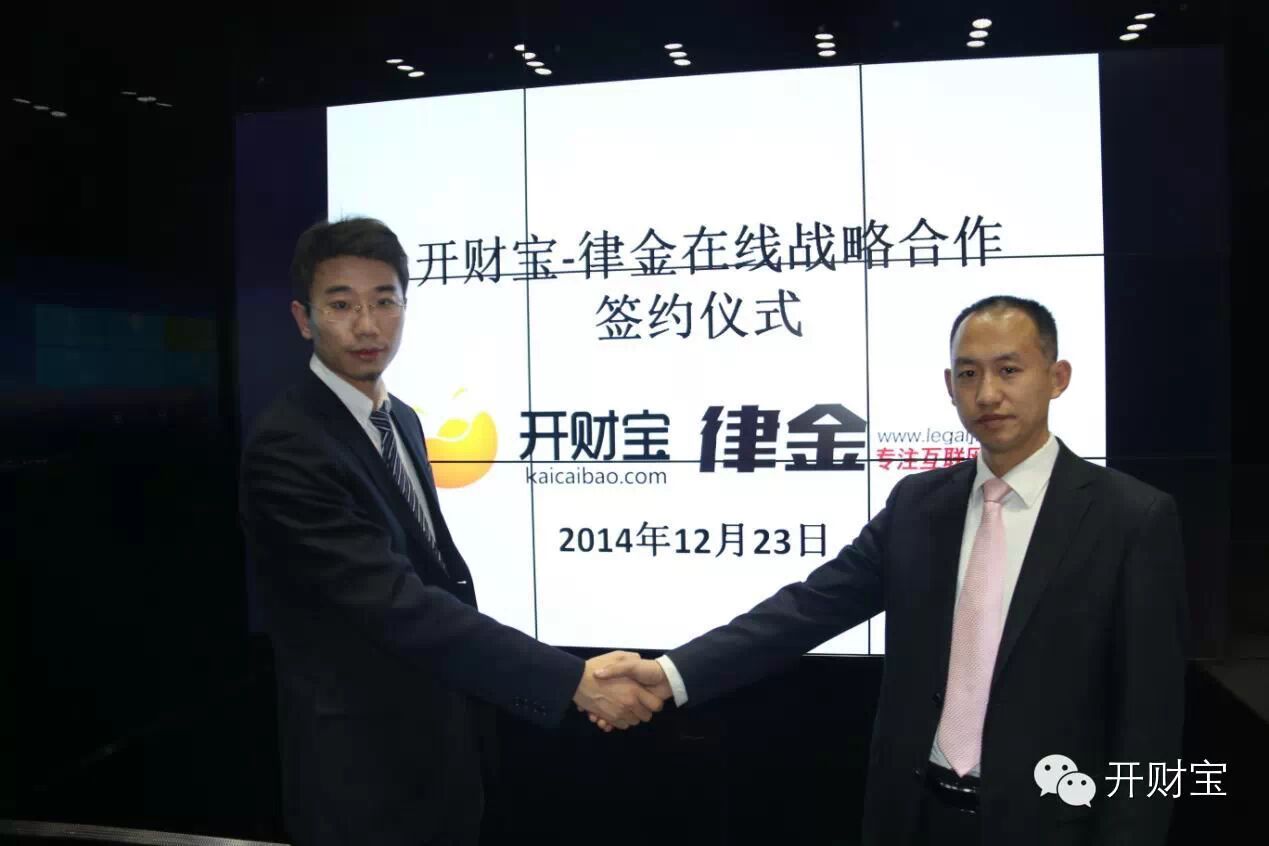 2014年12月23日,开财宝与律金在线举行战略合作签约仪式,开财宝CEO魏勇先生与律金在线CEO李伯诚先生参加签约仪式,开启互联网金融合作新篇章。