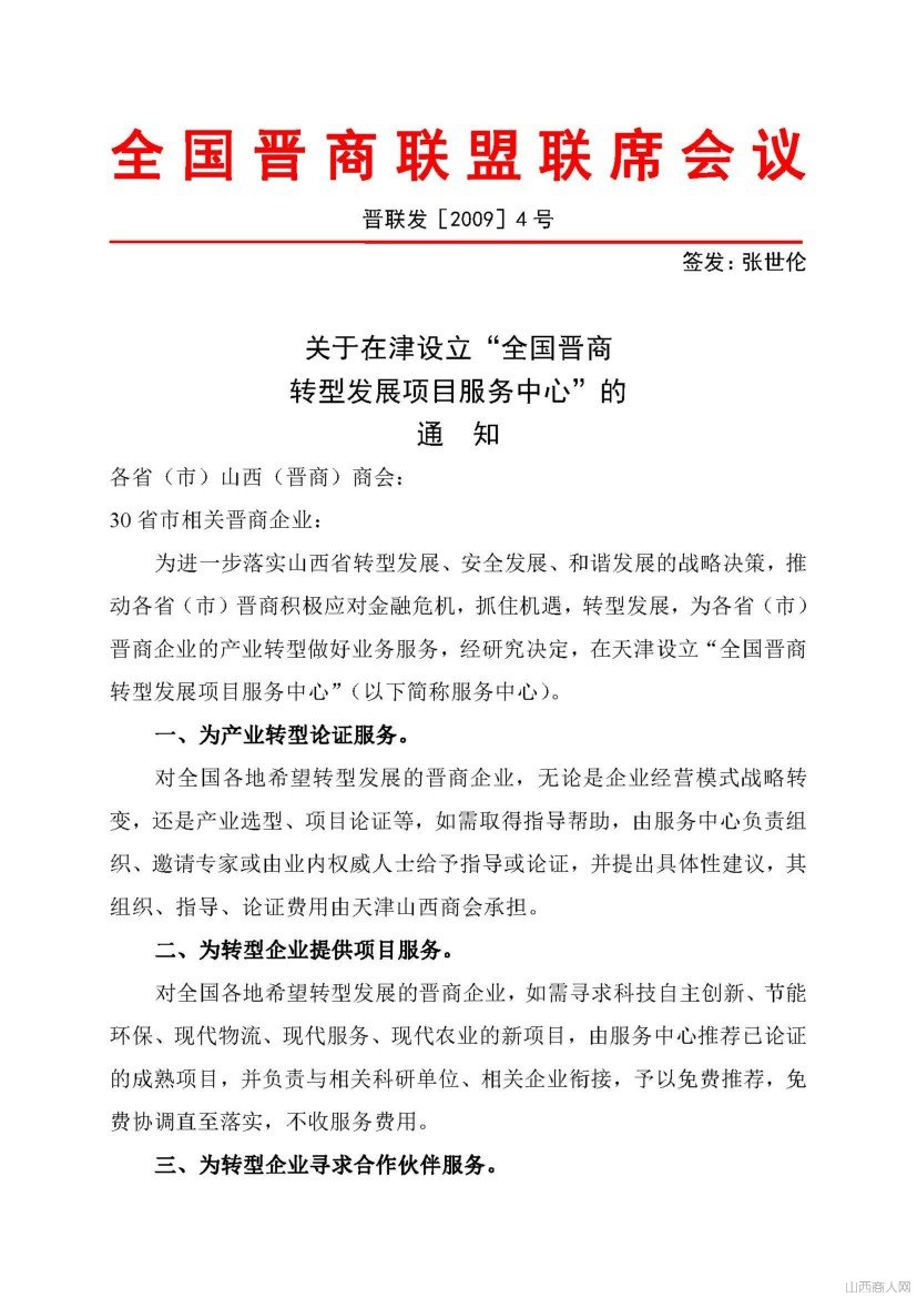 关于在津设立“全国晋商转型发展项目服务中心”的通知-全国晋商联盟联系会议