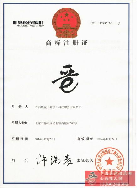 山西商人网核心商标正式通过国家商标总局注册