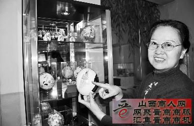 她向记者介绍了这件作品,这是一件反映晋商男人和女人的故事,整个蛋面分成四部分,东南西北四个方向,东西分别是男人和女人,男人处写有汇通天下,女人处羞答答地淑女形象,南北方向分别是走西口的沙漠情形和晋商大院。她说这就是男人在外闯天下,女人在内相夫教子。
