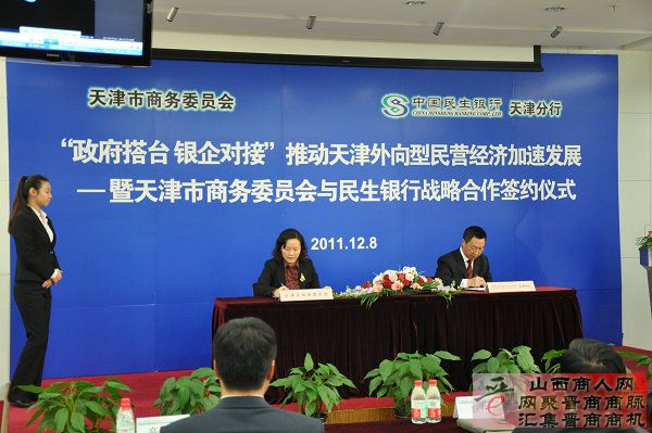 由民生银行、市商务委、市工商联共同主办的“政府搭台,银企对接,推动天津外向型民营企业加速发展暨天津市商务委与民生银行战略合作签约仪式”,于2011年12月8日下午在中国民生银行天津分行会议室举行。