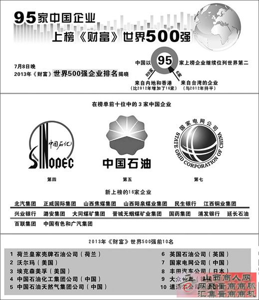 7月8日晚,2013年《财富》世界500强最新榜单揭晓,包括港澳台在内,95家中国公司上榜,中国大陆上榜企业由去年的73家增至89家,其中,总部位于山西的企业增至6家。
