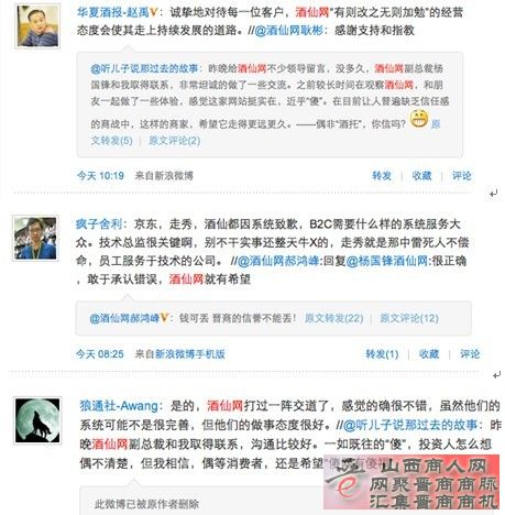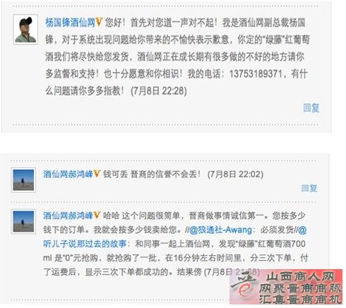 本为“抢购”成功而兴奋不已的这位网友接到这样的电话自然是大失所望,并且对酒仙网的“出尔反尔”大为不满,于是在微博上给酒仙网的多位领导反应此事。酒仙网董事副总裁@杨国峰酒仙网 和酒仙网董事长@酒仙网郝鸿峰 均在第一时间给予了回复。酒仙网副总裁杨国峰发微博针对网站系统错误问题向广大网友致歉,表示会按“0”元价格给网友发货,并留下了自己的手机联系方式;酒仙网董事长郝鸿峰在微博回复称,“钱可丢,晋商信誉不可失”,也表示会按“0”元价格为网友发货。