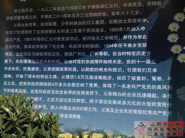 海南省山西商会秘书处发来悼词:哀乐低回,菊散云低,姚巨货老先生离开了我们。从白手起家到中国巨富,姚老先生沥尽一生心血创办了美锦能源集团。他曾说过:“商人自古重利,然一名真正的商人,则应重信尤胜于利。”如今,他虽然离开了,但在他身上闪烁着的正直的人性光辉,将成为他传递向后人的、最珍贵的财富与美德,是人们对他无尽的缅怀与思念。
