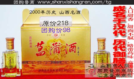 菖蒲酒2000年历史 山西名酒 35°双胞胎礼盒(2瓶*250ML) 原价218 团购价98 远在汉代已名噪酒坛,为历代帝王将相所喜用,并被列为历代御膳香醪 末代皇帝溥仪的御弟溥杰先生推荐 中国酒界酿造权威、著名品酒大师戴仁泽教授高度赞誉