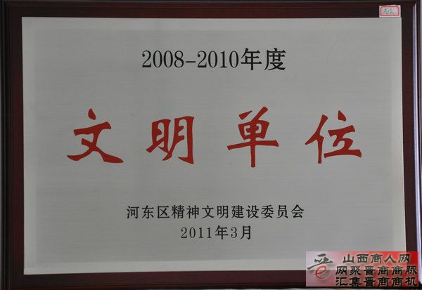 2011年6月,天津市河东区精神文明办公室授予天津山西商会“2008—2010年精神文明创建活动先进单位”。同时获得此项荣誉的还有会员企业“天津红旗环保科技有限公司”。据悉,河东区精神文明办推荐天津山西商会为“天津市精神文明创建活动先进单位”。