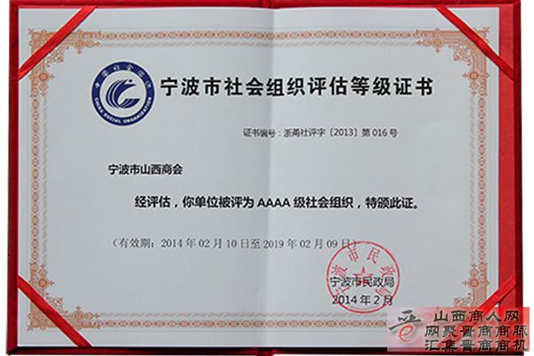 近日,2013年宁波市社会组织评估结果公布,宁波市山西商会在此次评估中被评为“AAAA级社会组织”荣誉称号。