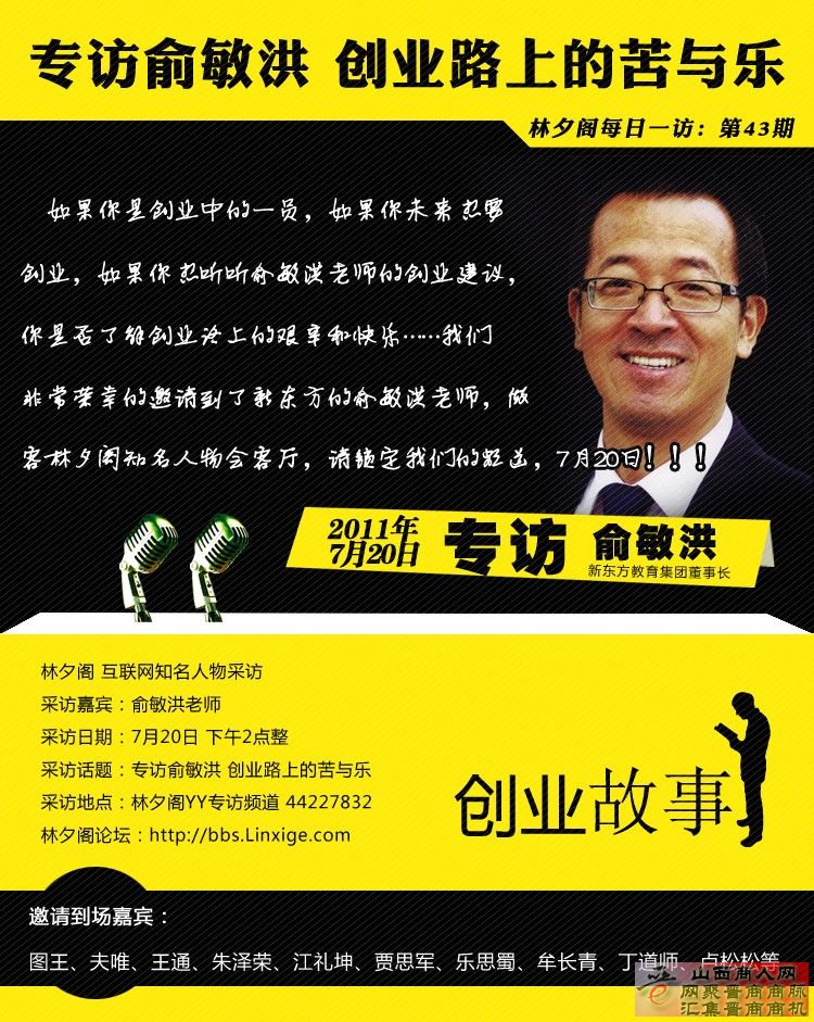 最新消息,新东方教育集团董事长俞敏洪正式接受林夕阁访谈,访谈时间定于2011年7月20日下午14点整,本次访谈晋商网特约评论员丁道师获邀出席,并将致辞发言。据悉,这将会是俞敏洪先生首次接受国内草根互联网创业组织的专访。