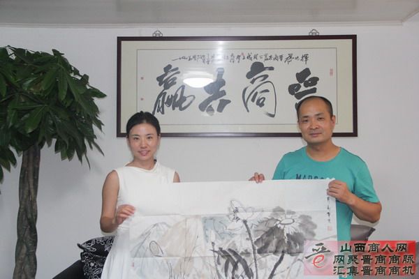 为了表示对中国晋商俱乐部的感谢,刘珊珊特意为刘文斌秘书长赠送了其母亲郭翠英的一副荷花作品,祝福彼此的友谊常青。