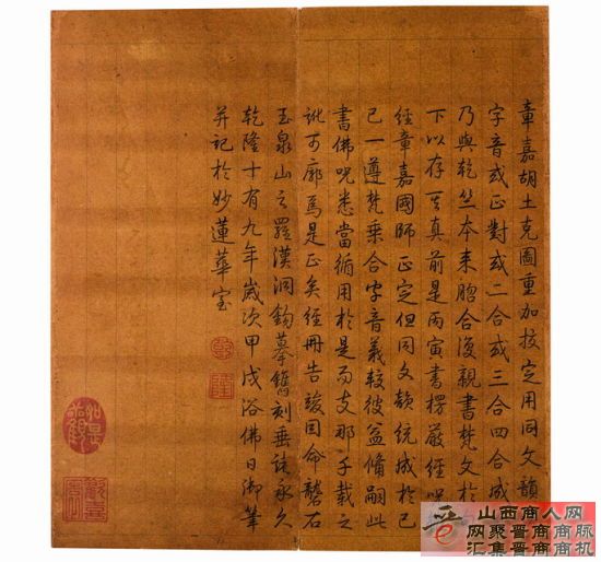 此次嘉德春拍清帝御书作品阵容强大,其中乾隆小楷《妙法莲花经》甚是难得。乾隆皇帝信奉佛教,勤政之馀,每手抄佛经以示诚笃。乾隆这次(十九年甲戌)抄写译定的《妙法莲花经》据《秘殿珠林》记载共“折装七册”,今现身的是其第七册。由于“秘殿”诸玺及“古稀天子”、“八征寿念之宝”等玺印皆钤于首册,本册仅钤盖了“干”“隆”、“如是观”、“观喜园”诸印,然不论从册数、页码以及跋文都与《秘殿珠林》所载吻合,书迹亦是乾隆圆熟的习见体貌,印章亦可信非伪,它是《秘殿》着录的该经第七册应是无疑的。因为册后有乾隆详记的校译抄写经过,本册就显得特别重要。