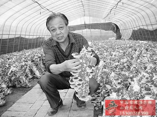 图为山西省泽州县南村镇陈庄村农民合作社社长申晋社拿着长满蘑菇的栽培袋告诉记者,山西农大专家是他们的科技“保护神”,合作社目前已发展到40多个菇棚,种植香菇、猴头等食用菌4万多袋。
