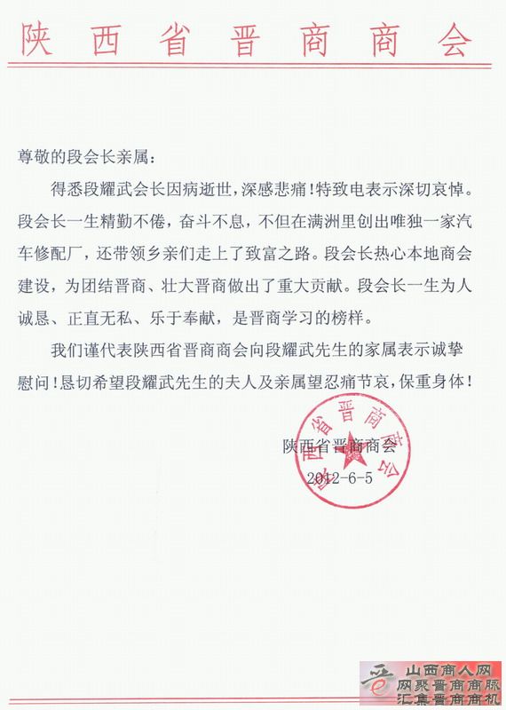 我们谨代表陕西省晋商商会向段耀武先生的家属表示诚挚慰问!恳切希望段耀武先生的夫人及亲属望忍痛节哀,保重身体!