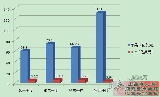 据统计,苹果公司2011年前三季度净利润分别为59.9亿美元、73.1亿美元、66.23亿美元。而HTC在2011年前三季度的利润分别为5.12亿美元、6.07亿美元、6.25亿美元。在2011年全年,苹果公司的净利润达到了309.23亿美元,而HTC2011全年的净利润为21.08亿美元。