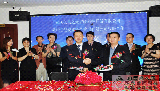 【山西商人网讯】4月19日下午16:00,在重庆亿星之光吉能科技开发有限公司总部大厅内,借助开业剪彩仪式的东风,在大厅LED大屏幕前,举办了重庆亿星之光与深圳汇银安盛资产管理有限公司战略合作的签约仪式。
