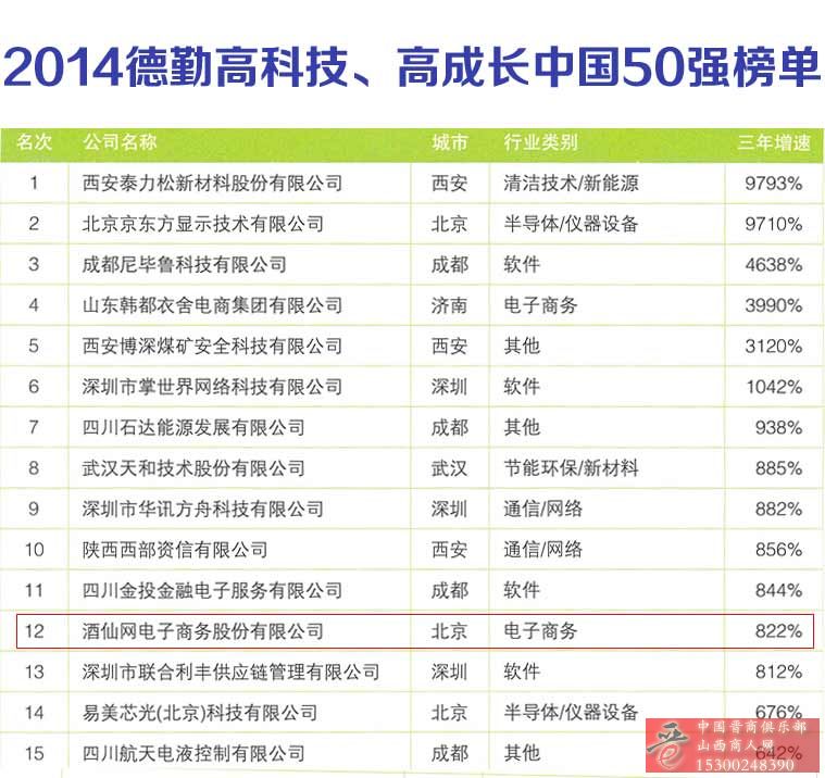 10月30日,“2014德勤高科技、高成长中国50强”颁奖典礼在深圳举行,会上发布了中国50强榜单,并由过百名高成长企业高管、政府领导、私募股权合伙人、法律财务等专业人士、媒体代表等共同见证。其中,酒仙网作为杰出代表,以三年增速822%的强势劲头荣膺榜单第十二位。值得一提的是,作为后起之秀,此次酒仙网成绩已远超阿里巴巴、腾讯此前的榜单名次。