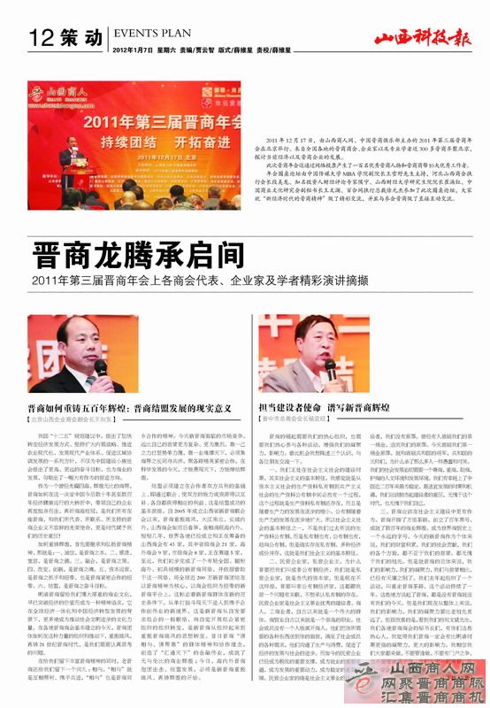 2011年第三届晋商年会于2011年12月17日在北京圆满落幕,此次晋商年会受到了山西省文联主席李才旺、山西科技企业家周刊的大力支持,山西科技报用2个版面报道了第三届晋商年会的盛况。