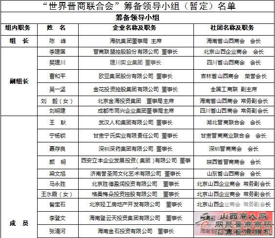 根据现场填写的表格反馈,会议决定由与会代表共同发起成立世界晋商联合会并形成了筹备领导小组(暂定)名单,拟由海南省山西商会会长、海航集团董事局主席陈峰担任筹备组组长,由北京山西企业商会会长、晋商联盟控股股份有限公司董事长李建国、四川省山西商会会长、建川实业集团董事长樊建川,吉林省山西商会荣誉会长、欧亚集团股份有限公司董事长曹和平,全国工商联副主席、金花投资控股集团有限公司董事长吴一坚,海南省山西商会常务副会长、北京金海投资集团董事局主席以及成都市同兴企业集团董事局主席刘明建担任副组长。