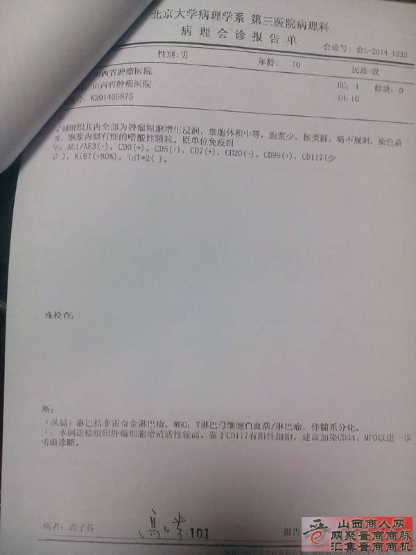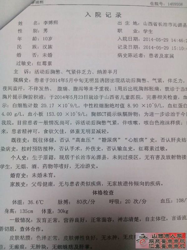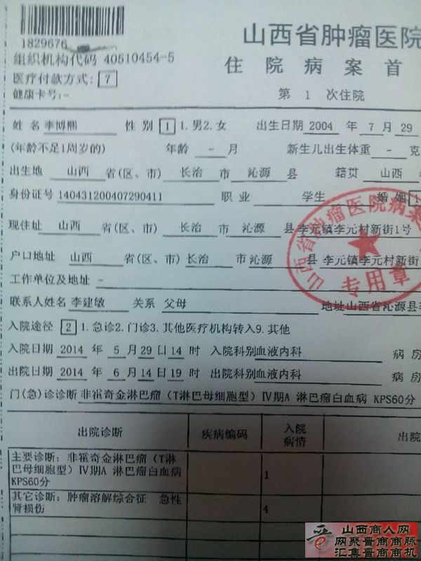 李博熙,男,10岁,山西省沁源县人,今年五月查出患有“非霍基金T细胞白血病淋巴瘤”,目前在北京301医院救治。因治疗所需花费巨大,家庭经济难以负担,特向社会各界求助。其父李建敏是我的朋友,电话:13903554553。