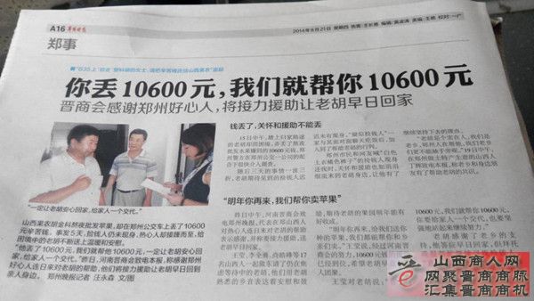 山西人老胡在郑州卖苹果丢失10600元钱,这对于一届农民来说是一年的辛苦钱,就在老胡焦急无助时,河南晋商会的山西老乡们向他伸出了援助之手,让他在异乡感受到了浓浓的乡情。郑州晚报、东方今报已经报道了河南晋商会援助老胡回家的感人事迹!此次商会帮助老胡募捐款,要大力感谢郭晋平,杨桂花,丁辉,窦小刚,窦洪波老乡的付出,是他们在商会和山西老乡中积极奔走,为老胡能够早日回家乡想办法联络老乡。老胡能够早日回家也要感谢他们给予的支持,感谢他们已经给老胡送去的温暖!