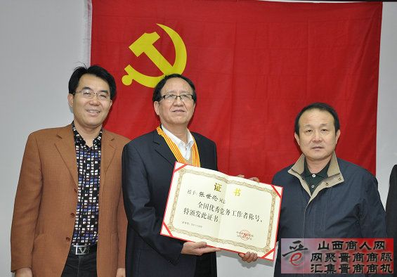 日前,天津山西商会会议厅,鲜红的党旗下,中共河东区常委、组织部部长温继平代表中央、市、区委组织部向天津山西商会党委书记、会长张世伦庄重地颁发了“全国优秀党务工作者”的奖状、奖章。温部长在颁发仪式上发表了讲话,他高度评价了天津山西商会加强民企会员党建,深入开展“创先争优”,不断创新社会管理,推动会员科学发展取得的成绩,称赞了张世伦同志—“你不仅是商会和河东区的骄傲,也是咱天津市的骄傲!”并勉励大家继续努力,在创新党的建设伟大工程中勇于实践,再创佳绩。