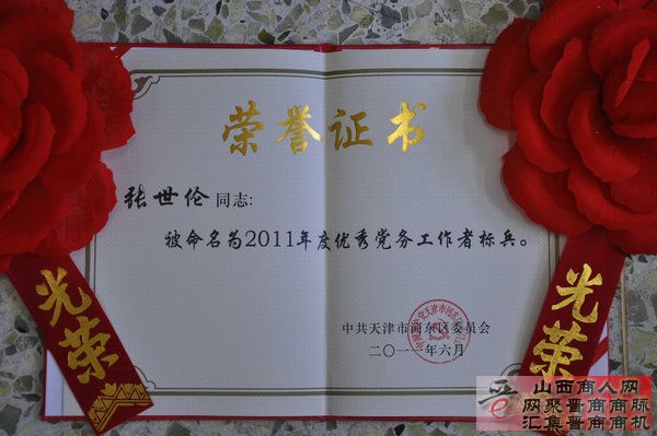 天津市河东区委授予张世伦会长优秀党务工作者标兵称号