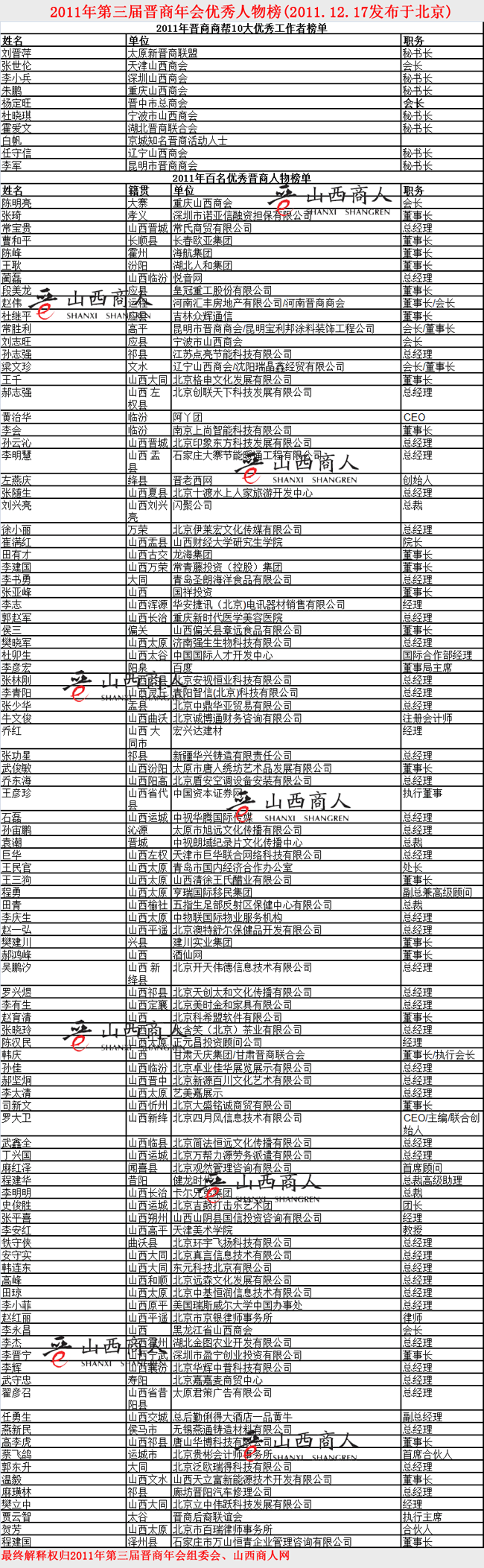 受2011年晋商年会组委会委托,公布2011年晋商商帮十大工作者和百名优秀晋商人物榜单如下: