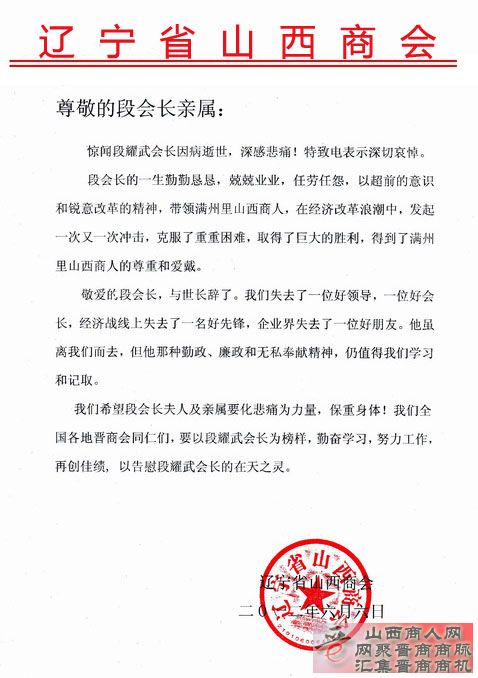 我们希望段会长夫人及亲属要化悲痛为力量,保重身体!我们全国各地晋商会同仁们,要以段耀武会长为榜样,勤奋学习,努力工作,再创佳绩,以告慰段耀武会长的在天之灵。