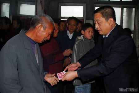 11月12日,一场漫天飞雪造访中镇霍山。山脚下,三教乡库拔村西一座普通的农家小院,迎来了一群特殊的客人。这天下午,霍州市委书记陈纲在有关部门负责人的陪同下,顶风踏雪来探慰双亲亡故、跟爷爷奶奶生活的小云飞。陈伯伯送来的御寒服暖在身上,字典上伯伯亲笔寄语“不幸应该成为你通向成功的垫脚石,应该使你更加努力、勤奋,更加自强不息”的话语暖在心头。从陈书记手里接过2000元救助金,小云飞爷俩禁不住泪流满面,泣不成声。