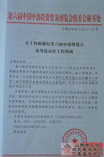 第六届中国中部博览会将于9月26日—28日在太原召开。经大会组委会反复筛选和论证,我天津山西商会副会长单位“山西大地文化传播中心”被授权为“第六届中博会独家市场化运营机构”。 各会员企业如有在中博会上做展位、广告宣传和其它指定产品与指定服务、专项冠名等需求,请与商会秘书处联系。 联系电话:022-85588029 ,高淑萍。