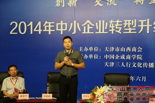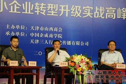 由天津山西商会主办、以“创新 交流 转型 发展”为主题的“2014年中小企业转型升级实战高峰论坛”,于6月13日上午在津利华大酒店举行。出席论坛的领导和嘉宾有:天津市工商联副主席范学义、天津山西商会会长张世伦、天津市中小企业发展促进局处长祝连合、天津山西商会常务理事天津锦美碳材科技发展有限公司董事长臧文平、中国企成商学院院长刘启成。论坛由承办单位之一、商会理事单位天津三人行文化传播有限公司总经理方涛主持。
