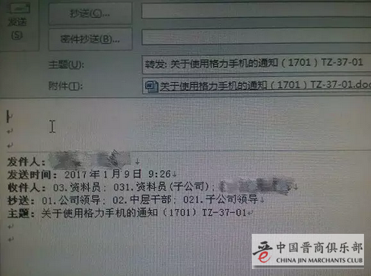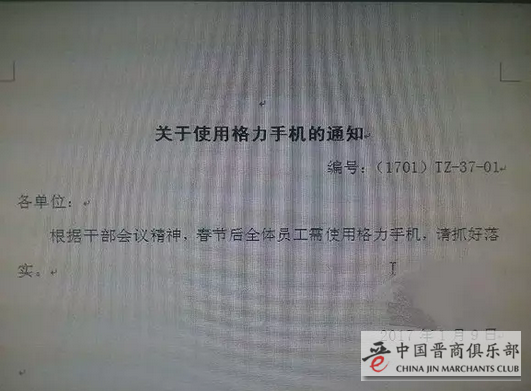 1月9日,网络流传格力员工被要求在春节后全员使用格力手机的图片。