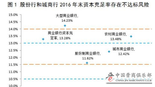 经测算,系统性重要银行的宏观资本充足率在11.5%-14%之间,非系统性重要银行的宏观审慎资本充足率在10.5%-13%之间。根据2016年末最新的资本充足率指标,大型商业银行为14.23%,高于宏观审慎资本充足率14%的高位值,指标相对安全;农村商业银行为13.48%,高于非系统性重要银行宏观审慎资本充足率13%的高位值,指标也是相对安全的;而股份制银行和城商行分别为11.62%和12.42%,介于10.5%和13%之间,存在一定不达标的风险(参见图1)。