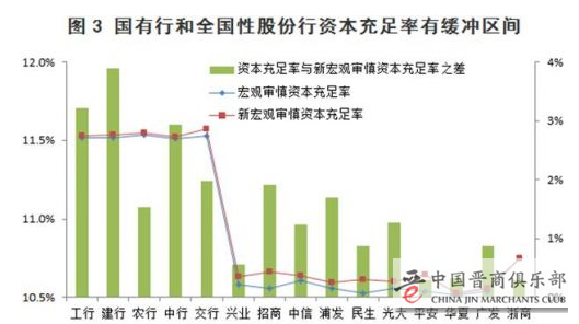 假设αi=1,βi在0.4%-0.8%之间(大型银行取值0.8%,全国股份制银行取值0.6%),目标GDP增速和目标CPI之和为10%,对国有大型银行和全国股份制银行的宏观审慎资本充足率进行估算,2015年各家银行的资本充足率都是高于宏观审慎资本充足率的。但是如果将αi调高至1.1%,或者将βi的取值提高,则部分银行会由A档落入B档。从目前看,国有大行和全国性股份制银行落入C档的概率不大,4%的资本充足率差额有一定缓冲区间(参见图3)。
